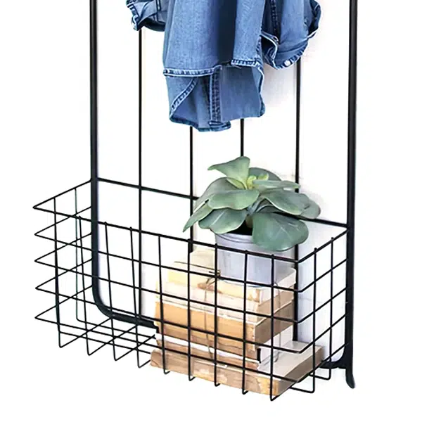 141 CM Wall Mounted Metal Coat Rack with Hooks and Storage Basket Hanging Coat Racks for Hats Clothes Towels and Purses Black