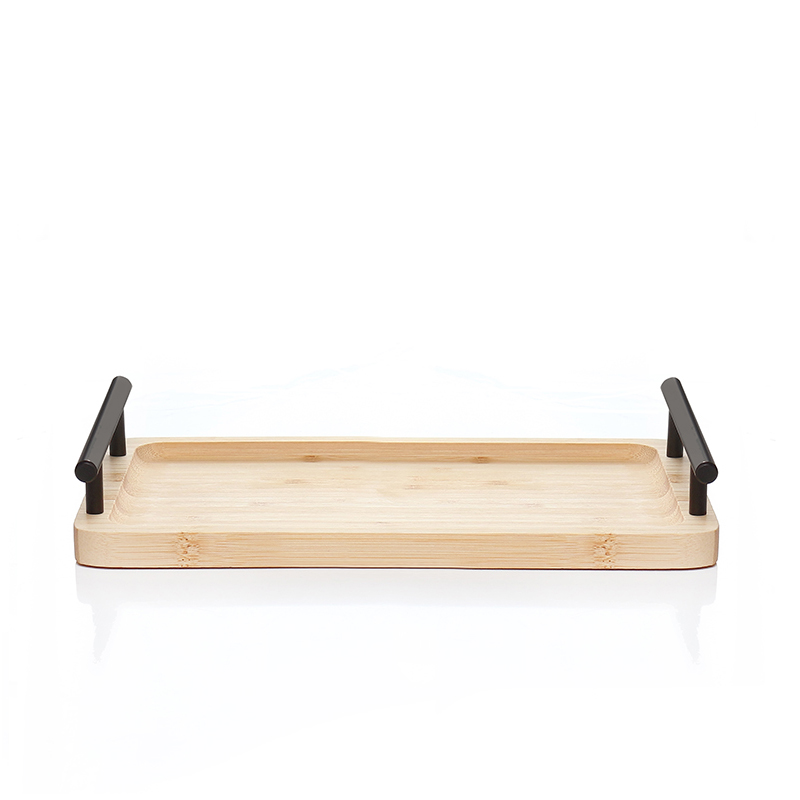33 CM Rectangle Bamboo Tray with Metal Black Handles Multipurpose Serving Trays for Food Drinks Snacks and Appetizers 1 Piece Beige