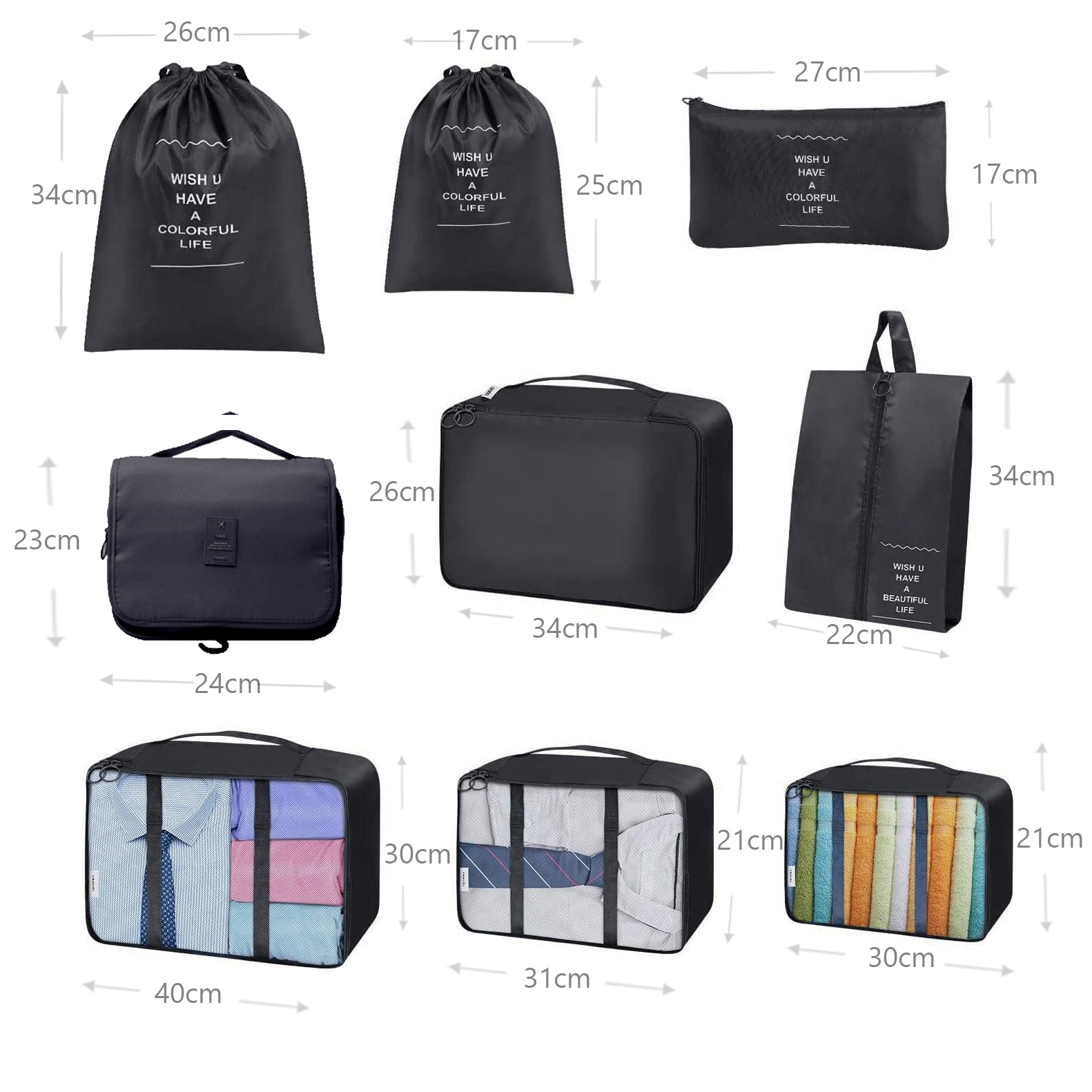 - Package Includes- 3x Storage Bag, 1x Shoe Bag, 1x Underwear Bag, 1x Toiletry Bag with Hook, 2x Drawstring Bag, 1x Flat Bag