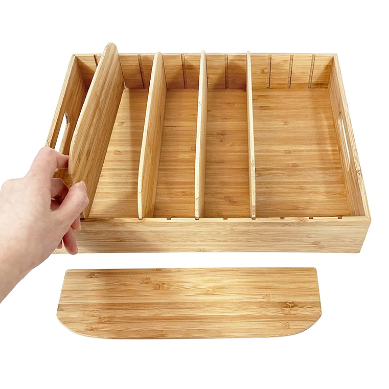 Bamboo Storage Organizer Box with 5 Adjustable Removable Dividers Multipurpose Kitchen Drawer Organization for Cutlery Lids and Kitchen Utensils