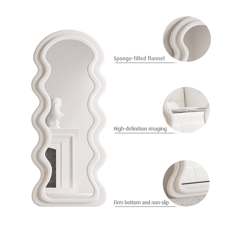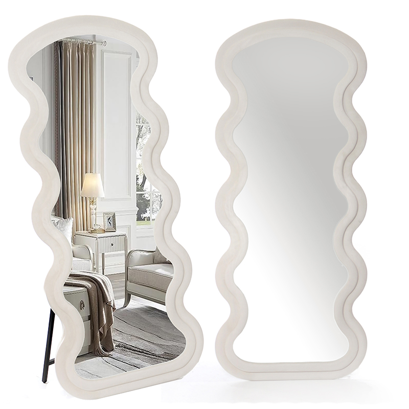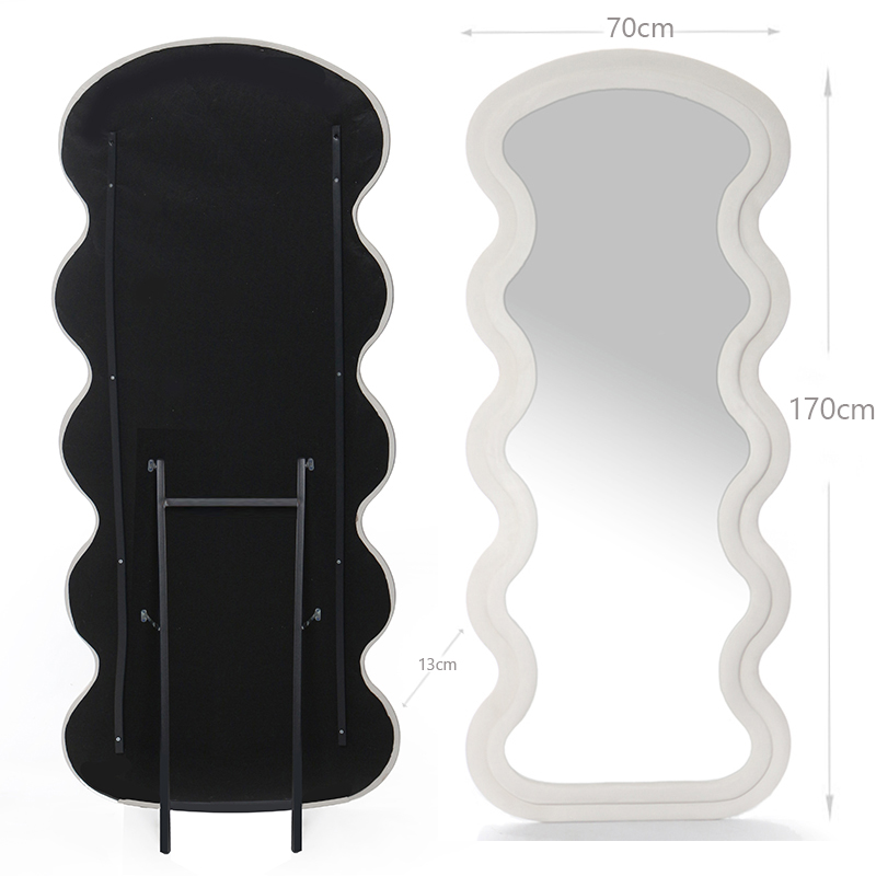 170 CM Full Length Mirror with Stand Irregular Wavy Mirrors Suede Wrapped Wooden Frame Standing Floor Mirror Hanging or Leaning Against Wall White