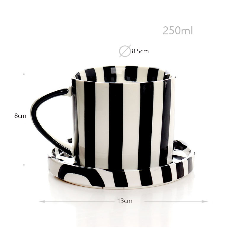 250 ML Hand Painted Ceramic Tea Mug with Matching Saucer Striped Coffee Cup Art Modern Design Mugs for Latte Milk and Hot Chocolate Black and White