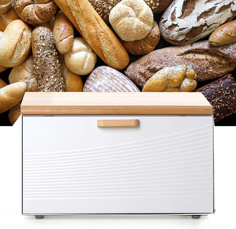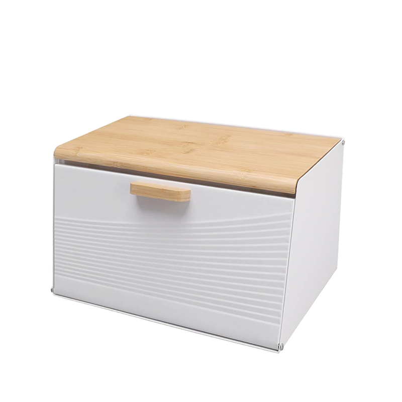 36 CM Iron Bread Box with Bamboo Flip Lid Large Capacity Bread Bin Space Saving Bread Keeper Holder Kitchen Storage Container for Bread and Cake White