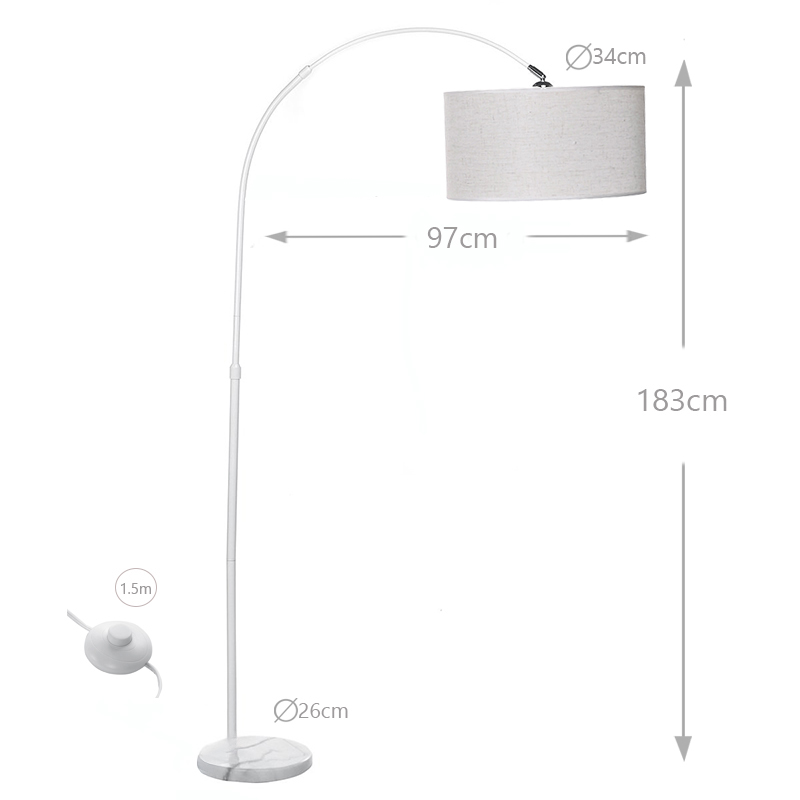 183 CM Metal Arc Floor Lamp with Lampshade and Marble Base Standing Floor Lamps Warm Night Lamps with Switch for Living Room and Bedroom White