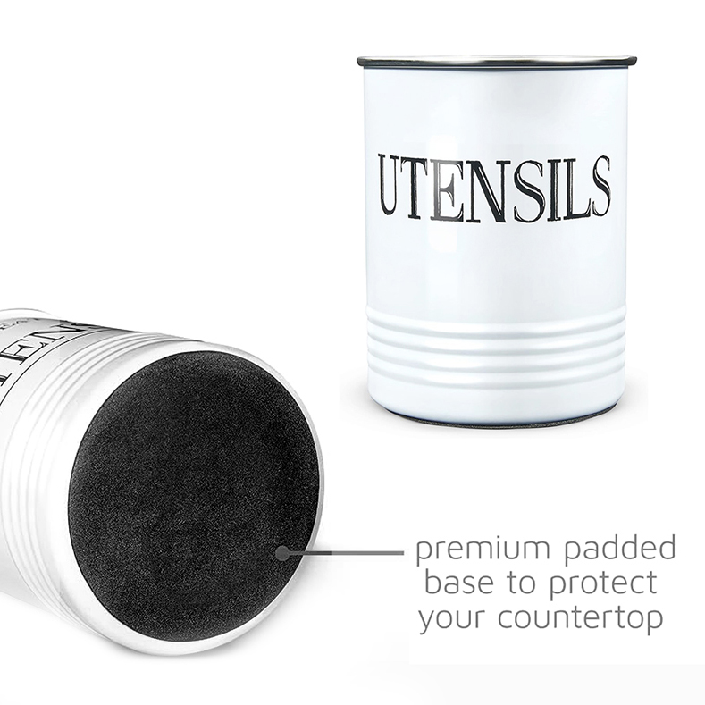 - Kitchen Utensil Crock- Match with any kitchen design. This white utensil holder will spruce up any kitchen and will keep all utensils organized. Premium padded base to protect your countertop.