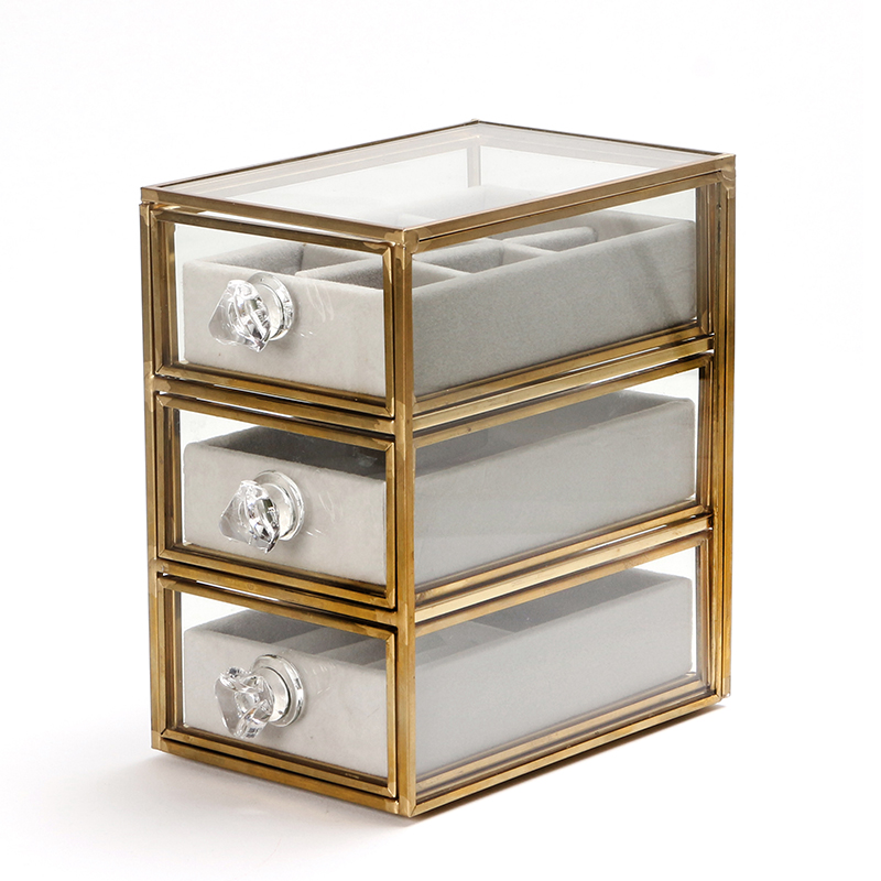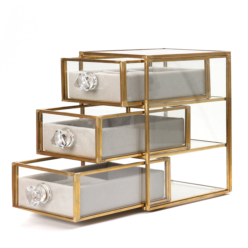 15 CM Vintage Glass Jewelry Storage Box with 3 Removable Drawers Multifunctional Organizer Box with Brass Frame for Earrings Rings Bracelet